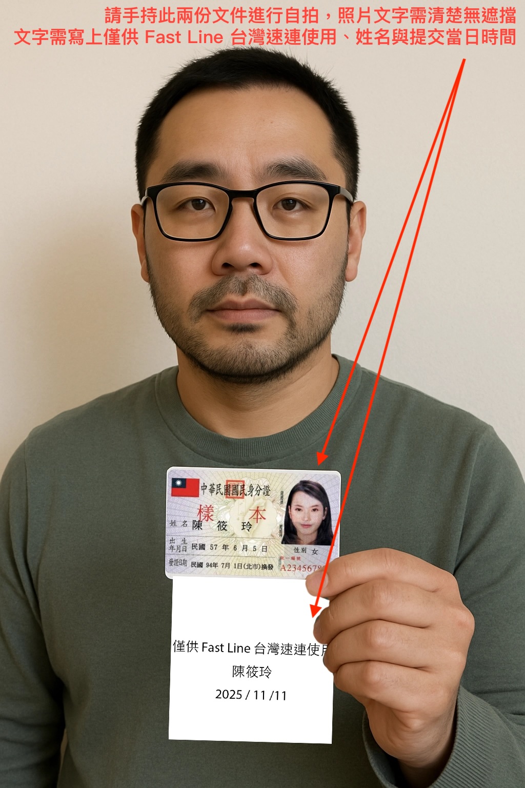 為配合政府打擊詐騙行動,您還需透過工單系統傳送您的手持證件自拍,並附上紙條寫下『僅供 Fast Line 台灣速連使用』,以及您的『姓名』和『當日時間』。