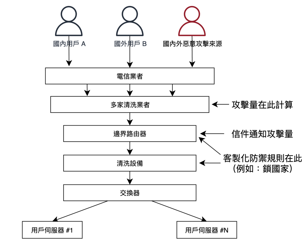 下圖是簡化後的流程圖。 由此圖片可衍生出以下常見問題的回答。 鎖國家可以減少超量的狀況嗎? 鎖國家並不能減少超量的計算,因為鎖國家是在後端進行,而攻擊量的計算在清洗業者這層。 信件通知的攻擊量感覺都很小? 我們的通知僅有第一層業者洗完後所漏下來的流量,如有需要調閱第一層清洗中心所收到的原始攻擊量,請與我們聯繫。